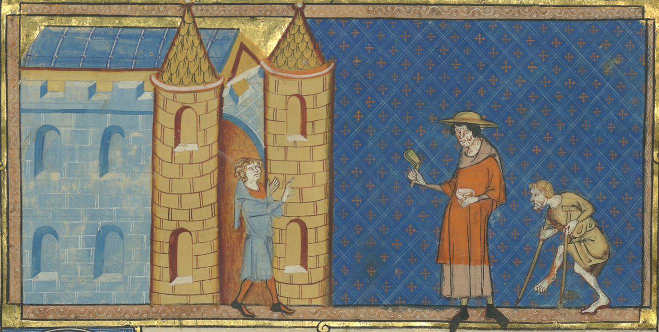 Двух прокаженных не впускают в замок. Миниатюра 14 века